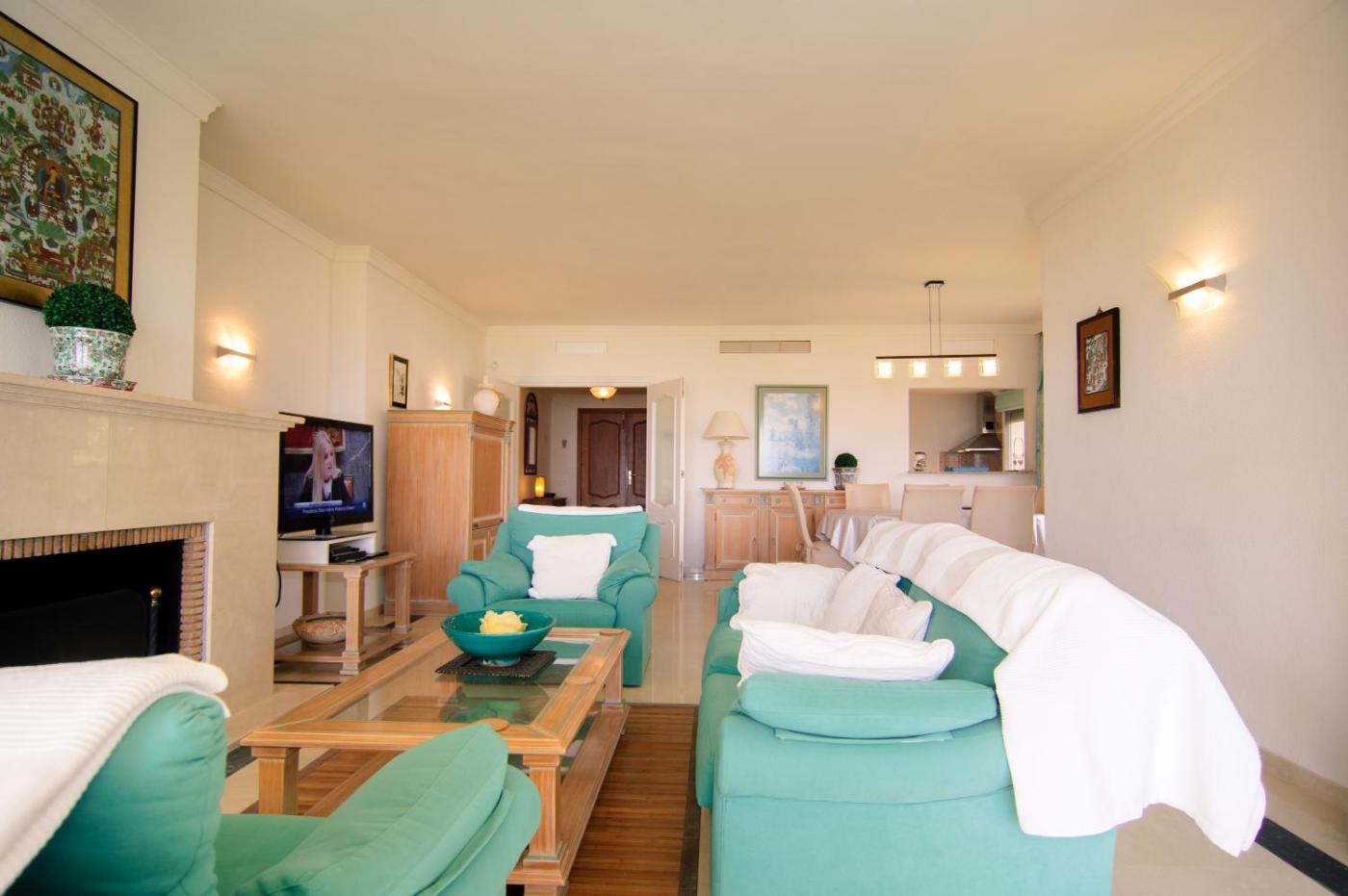 Apartamento de 4 dormitorios - Ático. Featuring a beachfront location, 3 terraces with panoramic sea views, and a shared outdoor swimming pool and sauna, this stylish 4-bedroom apartment is elegantly decorated and has lots of natural light. There is a spacious dining room, and a living room with a fireplace, sofa, 2 big armchairs, and flat-screen TV. There are 3 large bedrooms with built-in closets and en suite bathrooms, and 2 of these share a terrace with sea views. The last bedroom is smaller. Please note one of the bedrooms is a service bedroom located on the upper floor.