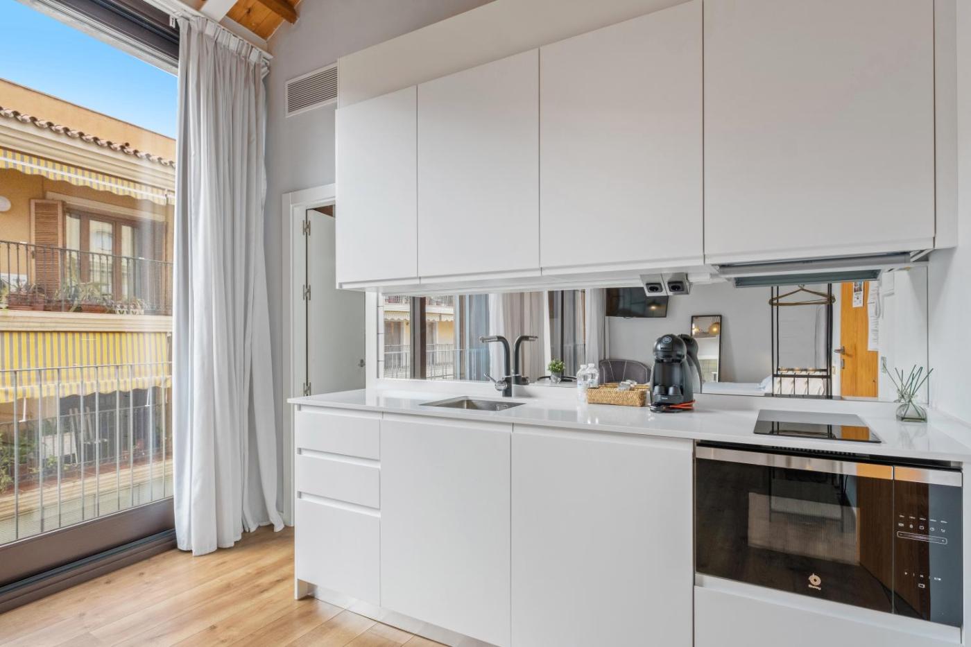 Apartamento Estudio exterior. Este apartamento cuenta con entrada privada, aire acondicionado, salala de estar, 1 dormitorio independiente y baño con ducha a ras de suelo y secador de pelo. La cocina está bien equipada con fogones, nevera, utensilios y microondas. El apartamento ofrece vistas a la ciudad y dispone de TV de pantalla plana, lavadora, paredes insonorizadas y teteracafetera. El alojamiento dispone de 1 cama. ;