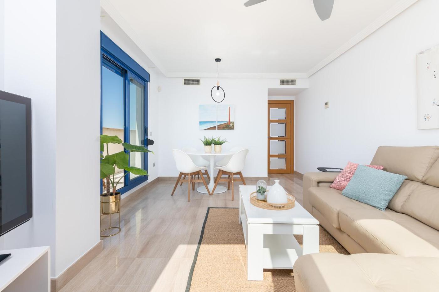 El apartamento cuenta con 2 dormitorios, 2 baños, ropa de cama, toallas, TV, zona de comedor, cocina totalmente equipada y terraza con vistas al mar.