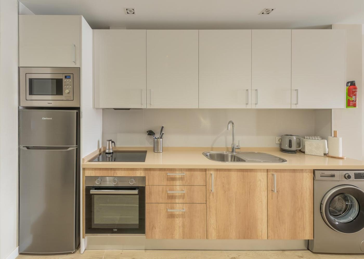 Apartamento de 1 dormitorio. Este apartamento tiene zona de salón, dormitorio independiente y baño con ducha y artículos de aseo gratuitos. La cocina está totalmente equipada con fogones, nevera, utensilios de cocina y horno. El apartamento ofrece aire acondicionado, zona de estar con TV de pantalla plana, lavadora, cafetera, zona de comedor y armario. El alojamiento cuenta con 2 camas. ;