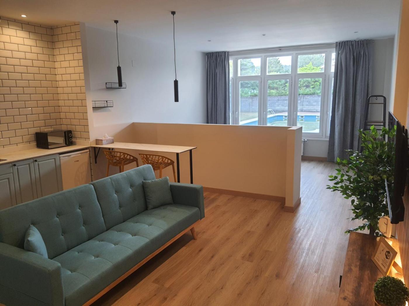 Habitación Cuádruple Deluxe. The spacious quadruple room offers a washing machine, soundproof walls, as well as a private bathroom boasting a bath and a shower. In the well-equipped kitchen, guests will find a refrigerator, kitchenware, a microwave and an electric kettle. The quadruple room has parquet floors, a seating area with a flat-screen TV, a dining area, a wardrobe as well as pool views. The unit has 3 beds.